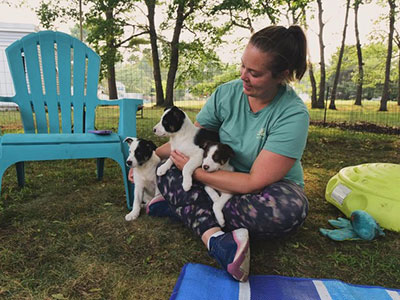 My name is Katie Anderson and I live in on the coast of Maine. I first fell in love with Border Collies as a child when my parents decided that bringing home a BC puppy to a family with 3 kids under 10 living in a busy Connecticut neighborhood with a postage stamp yard was a good idea (ironic, given this is the very situation that many BCs we are contacted about are relinquished from). It was love at first sight for me, even when the puppy threw up all over me on the way home. Chicory turned out to be the perfect fourth player for countless 2 v 2 soccer games. I have so many fond memories of her impressive goalie skills, taking her to training classes, and going off to explore trails with her during my brother’s boring baseball games. Even after Chicory had gone and my family decided it wasn’t ready for another dog, I still managed to get my dog fix by helping a local breeder bring her puppies to classes.